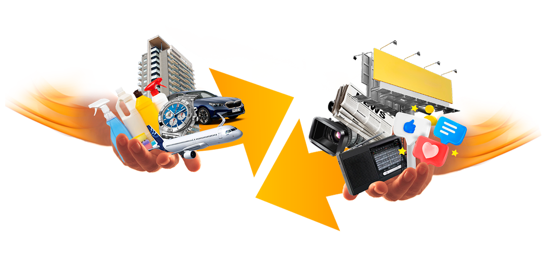 Somos un puente entre los bienes y servicios que las empresas necesitan vender y la publicidad de alto impacto que necesitan para crecer. A través de nuestro modelo de negocio, compramos productos o servicios a nuestros clientes y les pagamos con publicidad estratégica en los medios y plataformas más importantes del país, como radio, televisión, prensa, vía pública y canales digitales (Google/Meta).